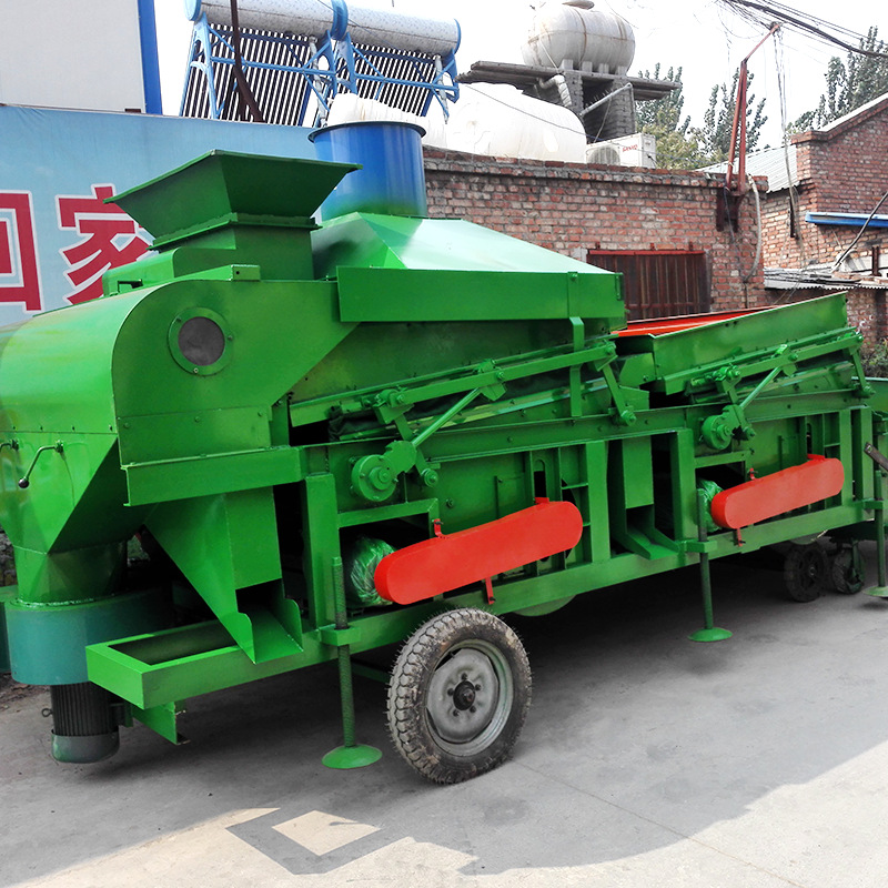 本機(jī)由機(jī)架及運(yùn)輸輪,傳動(dòng)部分,主風(fēng)機(jī)、重力分離臺(tái)、吸風(fēng)機(jī)、吸風(fēng)道、篩箱等組成,移動(dòng)靈活,更換篩板方便、性能良好等特點(diǎn)。